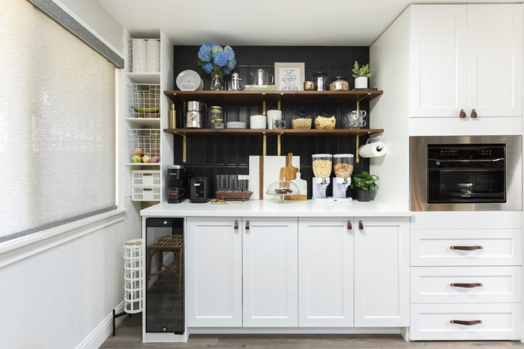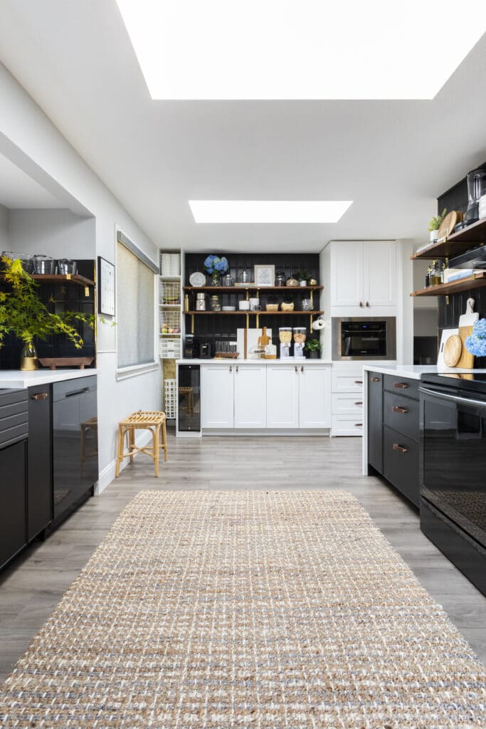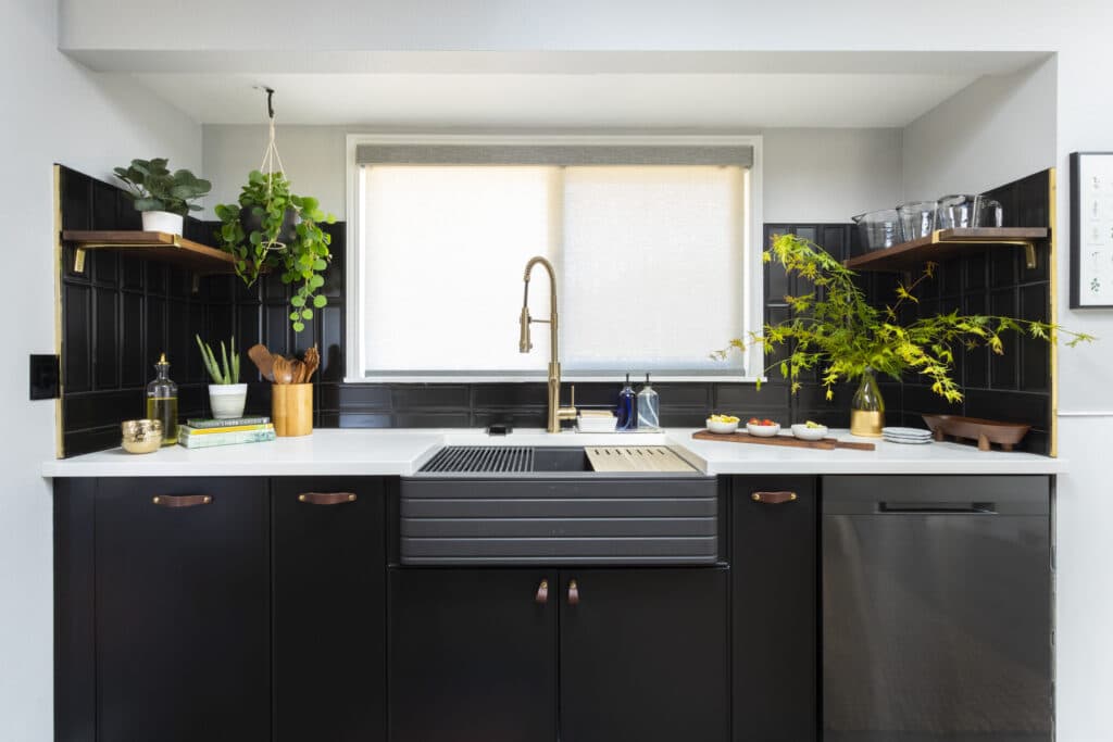 Careful planning allowed her to remove upper cabinets, which opened up the space. She used BOXI’s matte Black Peppercorn base cabinets on either side to create a beverage station with flanking storage. Above the white bank of cabinets, Rejuvenation slatted walnut floating shelves with brass brackets stand out against the black subway tile backsplash.
