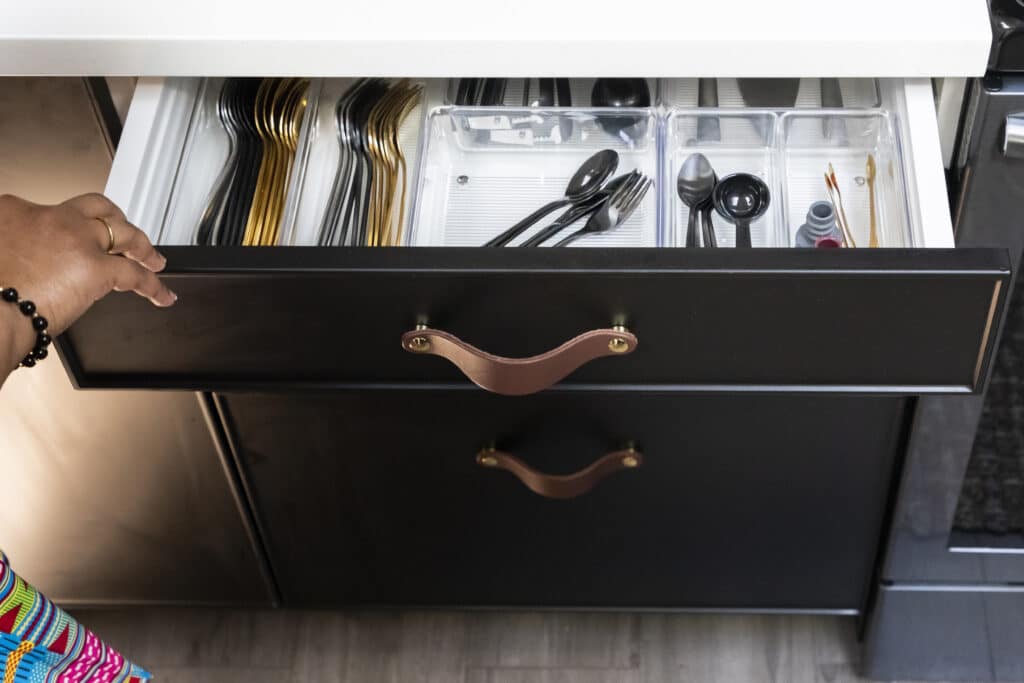 Convenience was also key in her kitchen design scheme. Buabeng installed 10 drawers and nine pullouts, which maximize storage space in small kitchens and are an adaptive choice fit for all ages and abilities. She only resorted to shelves where pullouts wouldn’t fit. Her mother, who struggles with arthritis, loves that she doesn’t have to get on the floor to reach a jar in the back of a cabinet. “Her mind was blown,” says the designer. “Just being able to bring the shelves to her was a game-changer.”