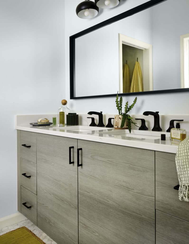 Though Mullaney rejected the idea of white cabinets, she embraced the milky hue with durable Calacatta Miraggio Gold quartz countertops, which are repeated in the bathroom atop a BOXI by Semihandmade Rye Slab vanity. A clear subway tile backsplash brightens the look, too, intentionally reflecting the walls behind it. “I think we accomplished creating a little bit of depth with that,” she reflects.