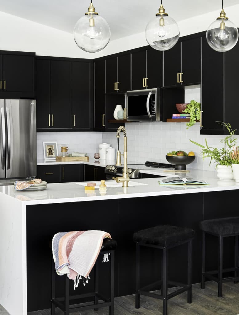 After Mullaney installed farmhouse-style gray wood floors, she sought out contemporary cabinetry to balance out the rustic material. White slabs didn’t seem to fit the rugged locale, so she opted for BOXI by Semihandmade Peppercorn Edge fronts instead. “Aesthetically, it was important for it to make a statement,” she explains. “We have so much natural light and the space is open that I really felt like we could pull off black.” During the process, Mullaney was grateful to have an invaluable, built-in design resouce in IKD. “The process was so easy. They outlined the measurements and our goals for the remodel. They were flexible about moving things around as needed to make sure the final design was user-friendly and efficient on space,” she adds.