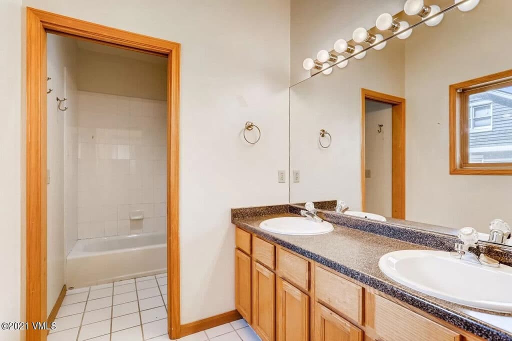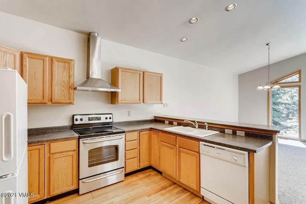 Even though the floor plan remained the same, the interior still needed to be gutted and refreshed. Mullaney gave the U-shaped kitchen the most dramatic transformation with the help of Inspired Kitchen Design, swapping out orange-tinged wood and Formica for a sleek black-and-white color palette. The result is a mountain modern cookspace that’s chic for hosting guests and fully functional for crafting elaborate post-skiing dinners.