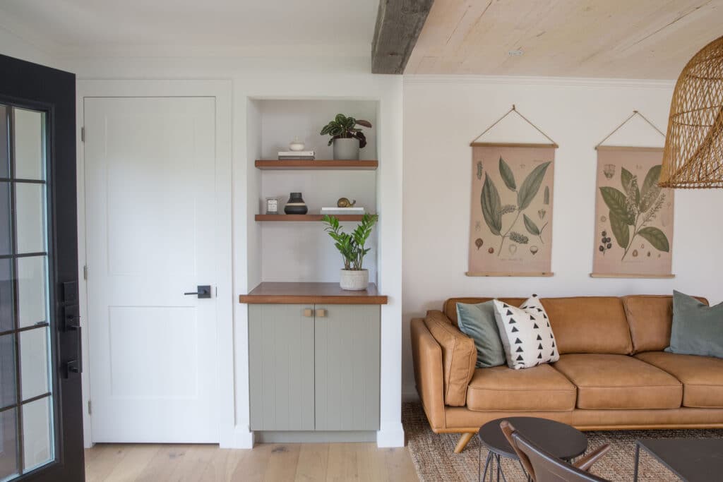 Designer Heidi Parrish filled the empty space on either side of a tall stone fireplace with base cabinets finished with Semihandmade DIY Shaker fronts and natural wood floating shelves. We love how the gray-green hue pairs with the cool tones and mixed patterns in the room.