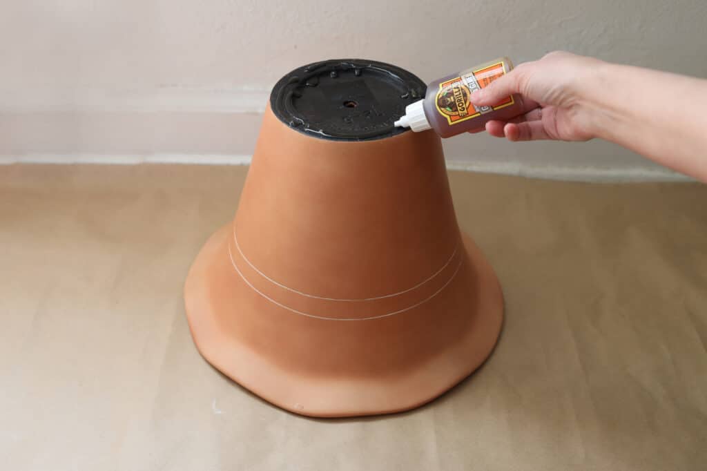 Turn the first planter upside down, and pipe a generous amount of glue around the outer rim.