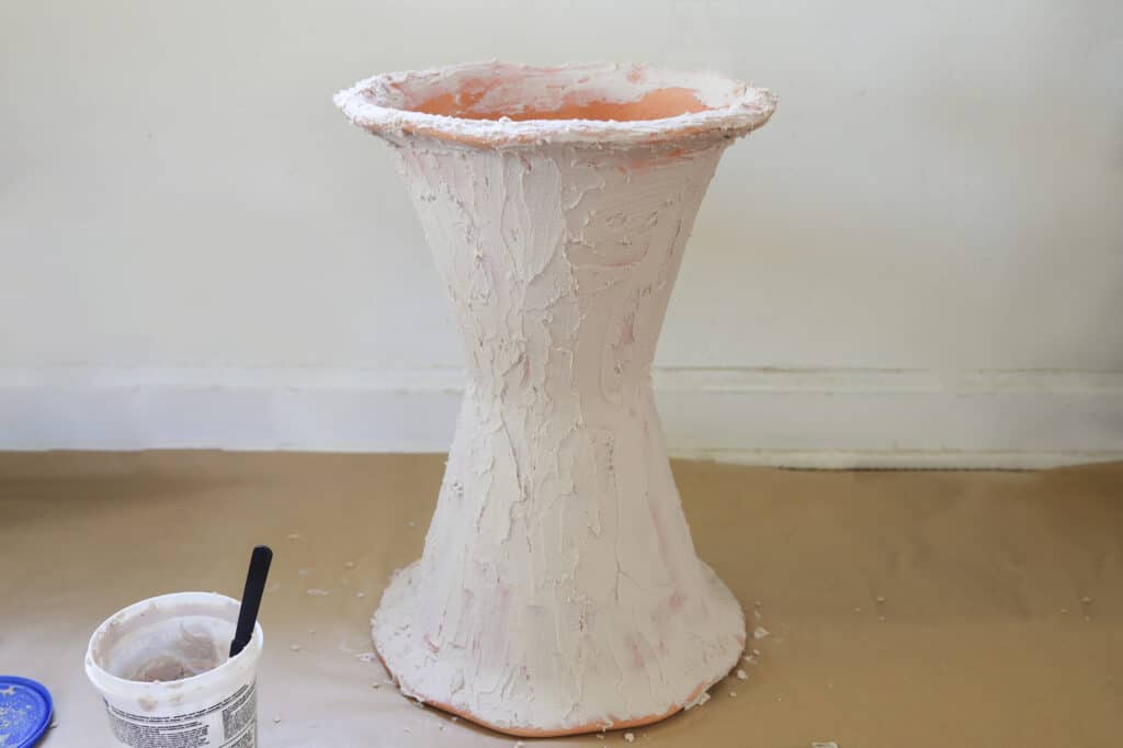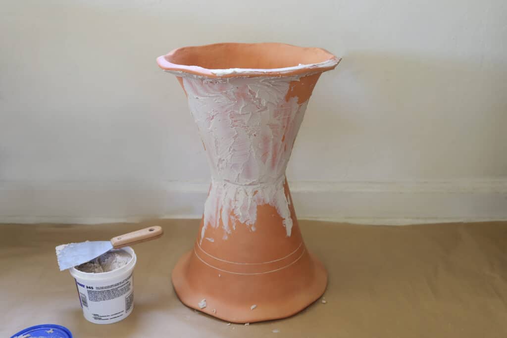 Once the glue has dried, use a putty knife to apply a thin layer of concrete patch over the entire surface of the planter. It doesn’t have to be perfectly even—you just want to get a good base coat. Let it dry overnight.