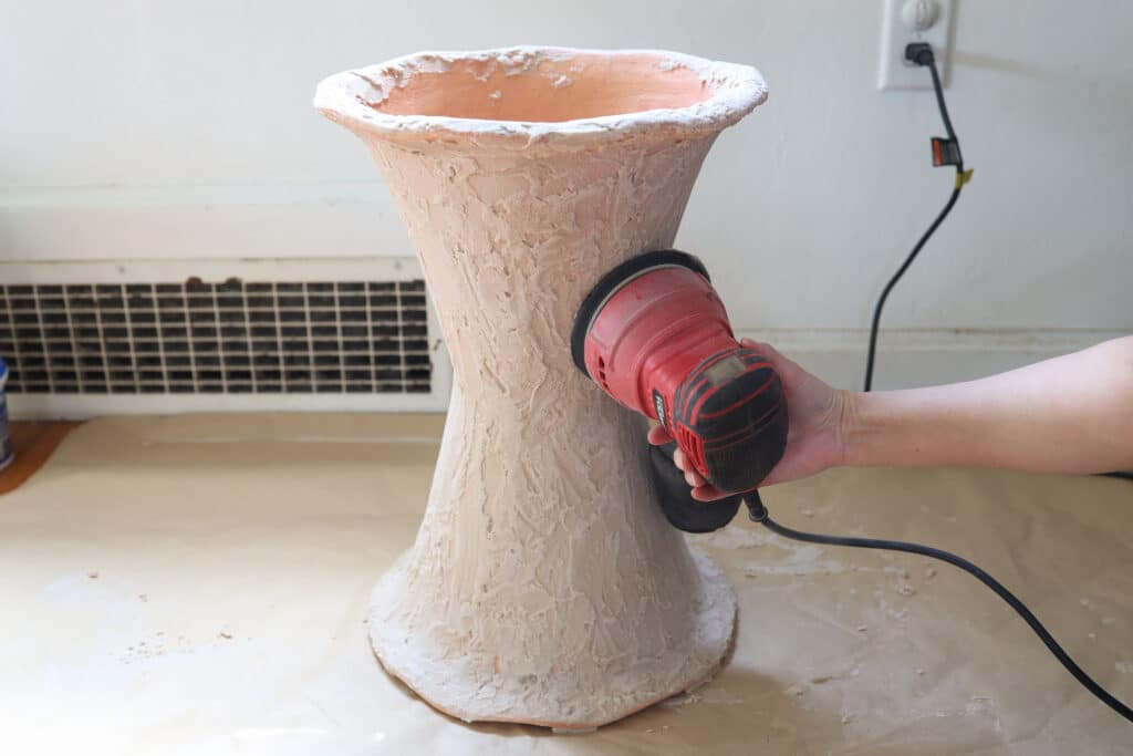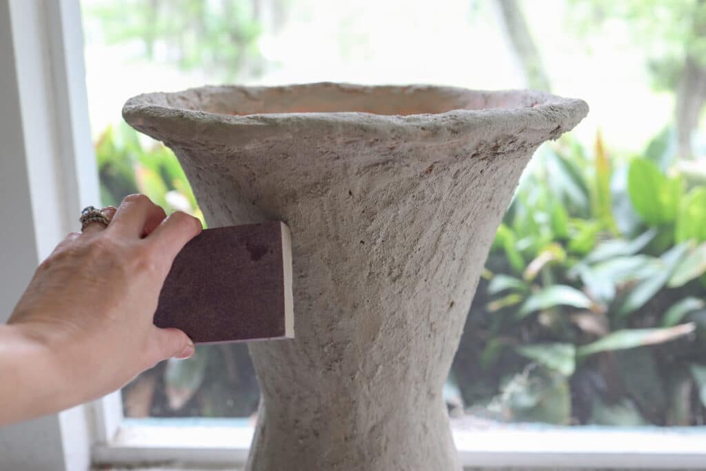 Once the fast-setting cement has dried, the planter should have more of an aged crumbly concrete look. If needed, you can hand sand any raised areas with a medium-grit sanding block (be sure to wear a mask).
