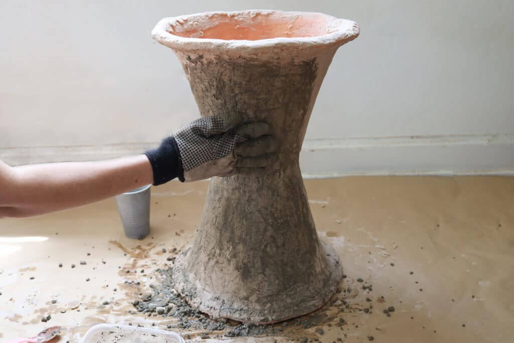 After sanding, mix up a 2:1 ratio of fast-setting cement and water inside of a disposable bowl or container. It should look somewhat like watery mud. While wearing gloves, apply the cement mixture to the entire surface of the planter with your hands. Smooth as you go, and fill in any gaps or holes. Aim for a generous coat over the entire planter, and then let dry for a few hours.
