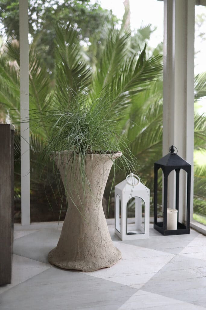 Add potting soil and your favorite greenery or flower inside. I chose ornamental grass because I love to watch it when the wind blows.