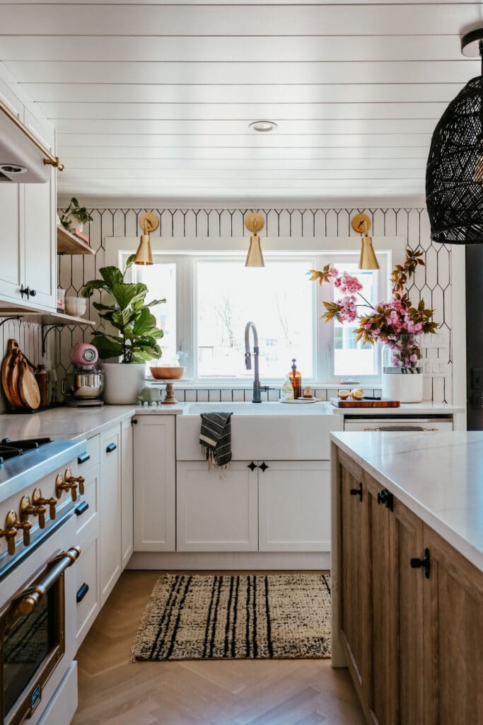 The beauty is in the details of this kitchen by Brooke Christen: Counter-to-ceiling tiles with black grout, gold sconces, and herringbone floors all make the neutral-toned space feel exciting and dynamic. A long farmhouse sink provides plenty of room for plant-watering and dishwashing, in addition to mirroring the length of the window above it.