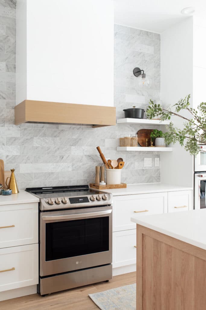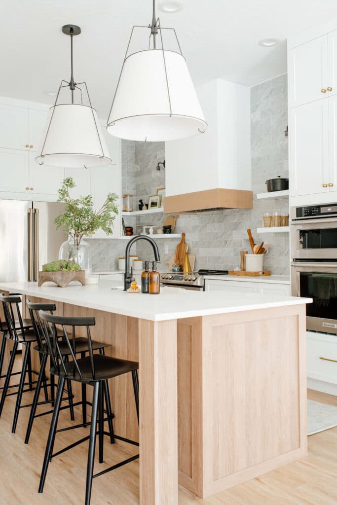 The kitchen, which now features white quartz countertops, a honed marble subway tile backsplash, Emtek hardware, Rejuvenation pendant lights, a custom hood, Semihandmade Supermatte White Shaker cabinet fronts, and Chris Loves Julia collaboration Cove fronts on the island. The clients wanted the look of a custom kitchen, but at a lower price point, thus Semihandmade was the right choice, as it allowed the designers to “create functional interior solutions with a really polished look,” Richards says. “We loved the combo of white and wood to help us achieve the modern farmhouse look we were going for.”
