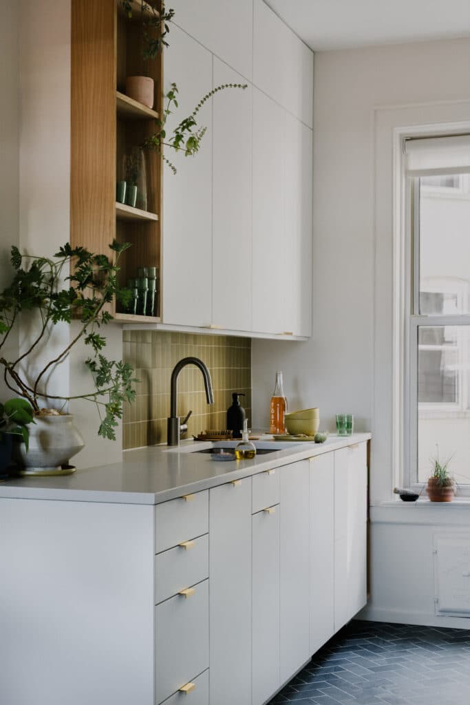 You might also consider expanding your countertop material to your backsplash—instead of opting for a tiled backsplash—if easy clean-up is a top priority for you. “Cleaning grout is awful,” Richardson says. “Plus, I loved the clean look of a backsplash naturally leading into a countertop.”