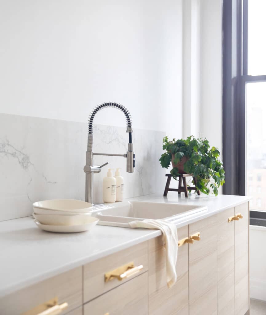Once you see a countertop sample with your cabinet color, you might end up changing your mind. “I loved how these countertops looked with my Desert Grey Shaker Semihandmade fronts,” Richardson says. “Plus, they paired well with my white paint, which has a warm undertone.” Remember: Every element of your kitchen design should work in harmony.