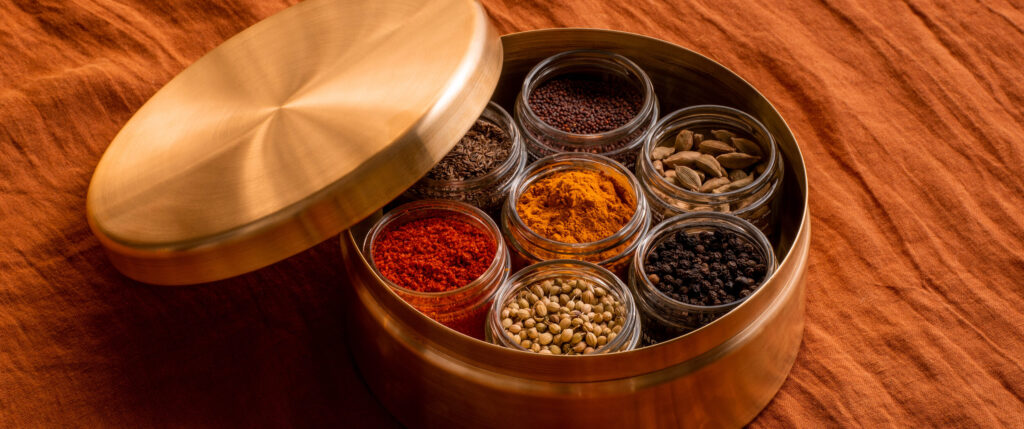 To bring out the vibrantly flavored oils, try dry toasting your spice. “Start with whole peppercorns and cumin seeds or chilies,” Javeri Kadri says. “You’ll know when they’re hot enough and ready when they start to dance (jump around in the pan). Then, add the powdered ingredients.” Or you could try blooming them. To do this, add a fat that fits your recipe (olive oil, ghee, or coconut oil) to a pan over medium heat and add your whole or ground spices. Cut the heat when they start to smell toasty and fragrant. Now that you know how to make the most of your ingredients, time to fill out your own Dabba: