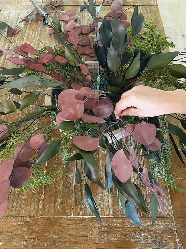 The star of her holiday table is the DIY floral centerpiece. While “it may look complicated and a bit daunting, I stick to a pretty simple technique that has worked for me every time,” she says. Overall, it took her 30 minutes, which included taking photos along the way. “There’s really no right or wrong way to do it—it’s a time to be creative and have fun!”