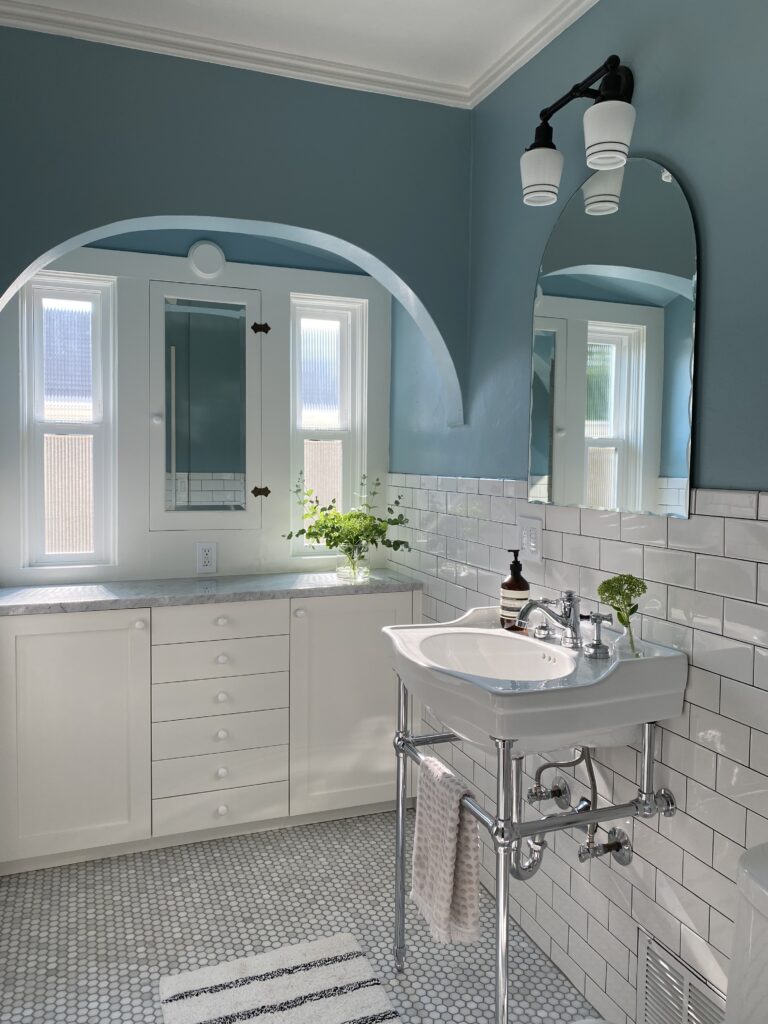 Mixing modern style with historic details was designer Jessica Gerlach’s aim when she began renovating the main bathroom in her historic Portland home. She also wanted to bring balance as it had been renovated by multiple owners over the last 90 years.