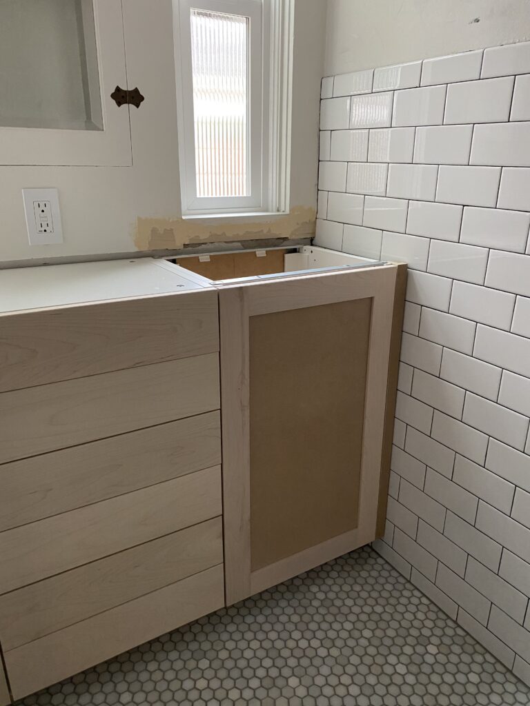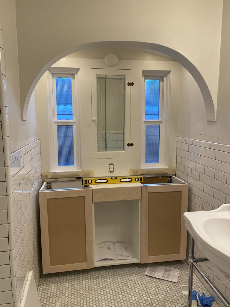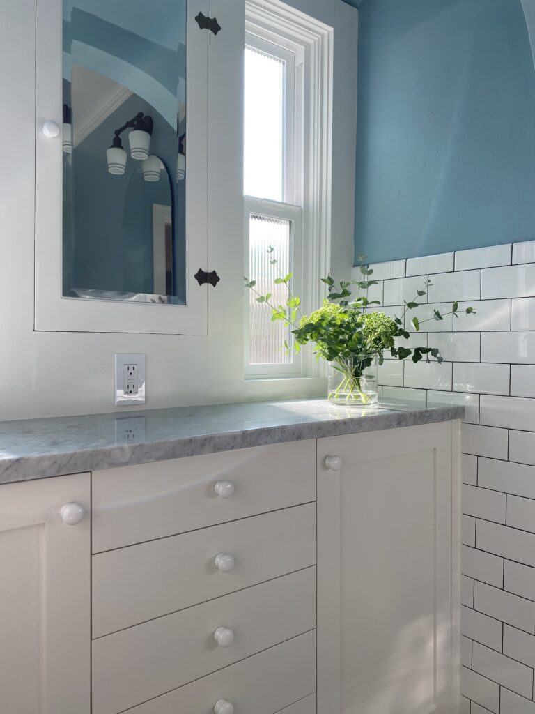 “I looked at photos of 1920s and 1930s bathrooms,” Gerlach says. “I saw lots of double windows flanking medicine cabinets.” Thus, she ultimately removed the dresser and replaced it with IKEA cabinets with Semihandmade fronts. “I did the DIY Shaker fronts. I chose that so I could paint them the exact same color the trim above the counter was painted,” Gerlach says. Sherwin Williams’ Alabaster made the new built-in piece one that seems as if it could have been original to the home.