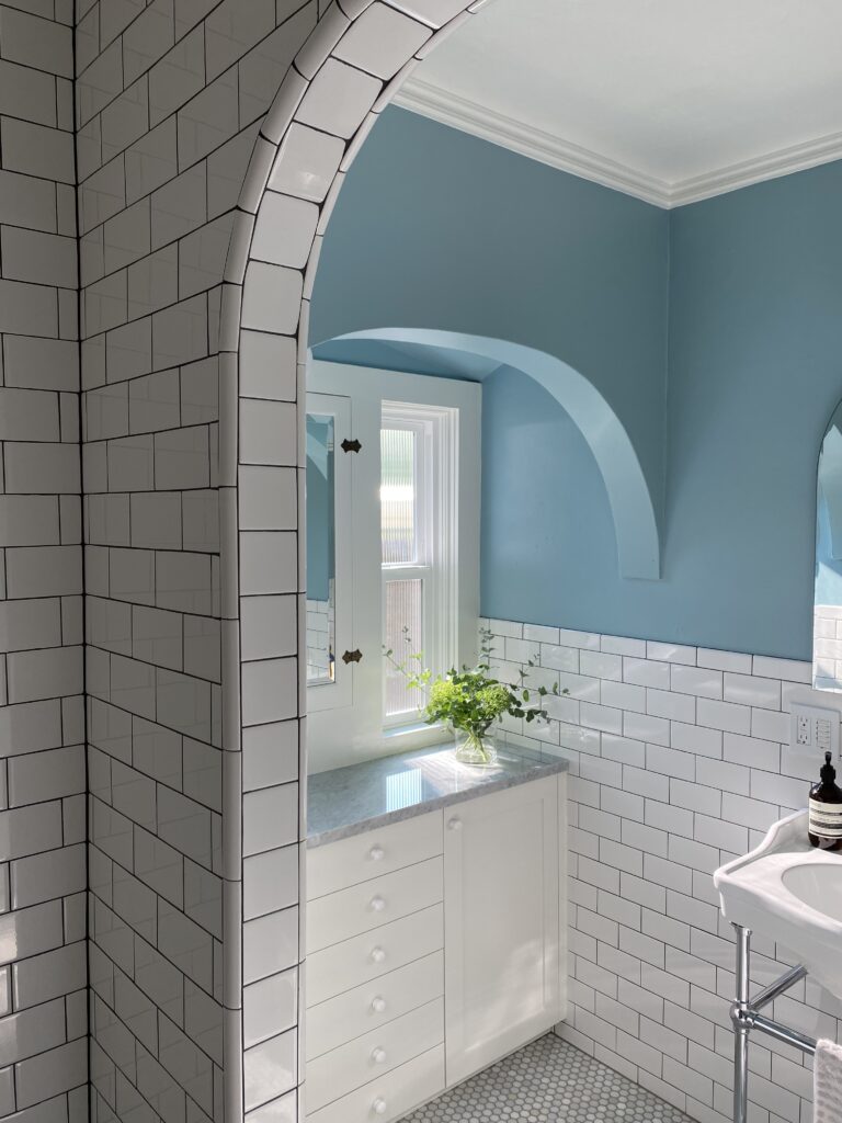 Choosing the right tile was a big piece in the design puzzle. During the demolition, she uncovered the original flooring, one-inch hexagon tile with a white-and-black floral pattern. Gerlach thought about recreating it, but instead chose a simple marble to mirror the marble vanity top. Additionally, she clad the bath enclosure and sink wall in white subway tile with dark grouting, which pops against Clare’s dreamy blue tint Summer Friday. “I love subway tile. I think it’s classic and bright and it’s affordable,” she says. “There are a lot of reasons why I love it, but I did want to do something a bit different.”