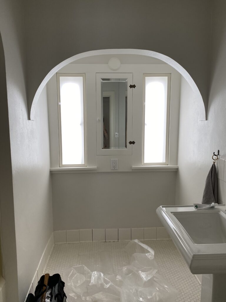 “This house was very quirky and needed a lot of love when we first moved in,” she says. The bathroom had vintage touches, but lacked cohesion. The tile floor wasn’t original, and neither were the pedestal sink nor tile backsplash. Furthermore, the previous owners had added a dark wood dresser for storage. In fact, the only original features were its cast iron bath tub, medicine cabinet, windows and arches gracing the tub and window enclosure. “This is a Tudor-style home built in 1929 and there are a lot of arches throughout the house,” she says, including in the living room, and on the leaded glass built-ins.