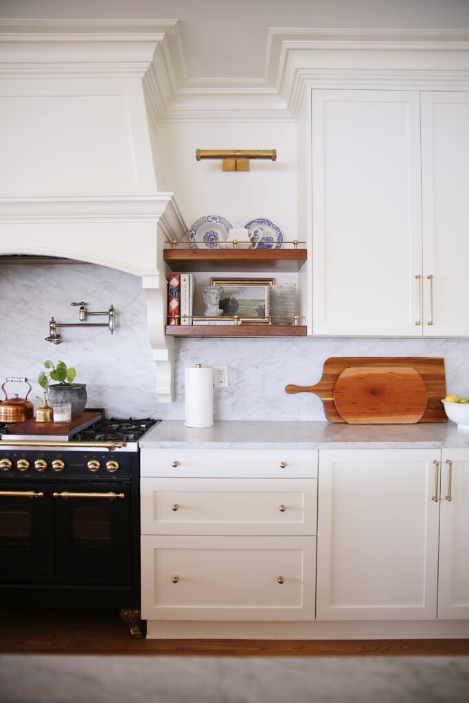 Mary Lauren adorned the kitchen with big crown molding, walnut shelves crafted by woodworker Wayne Wise, and an intentional mix of warm brass and cool nickel hardware. The show-stopper, however, is a 48-inch black Hallman range. “It’s such a beautiful piece and gave us that antique feel — claw feet and all — with a lower price point than others with the same aesthetic,” she reveals. It’s this expert balance of style and budget that sets the project apart from the rest.