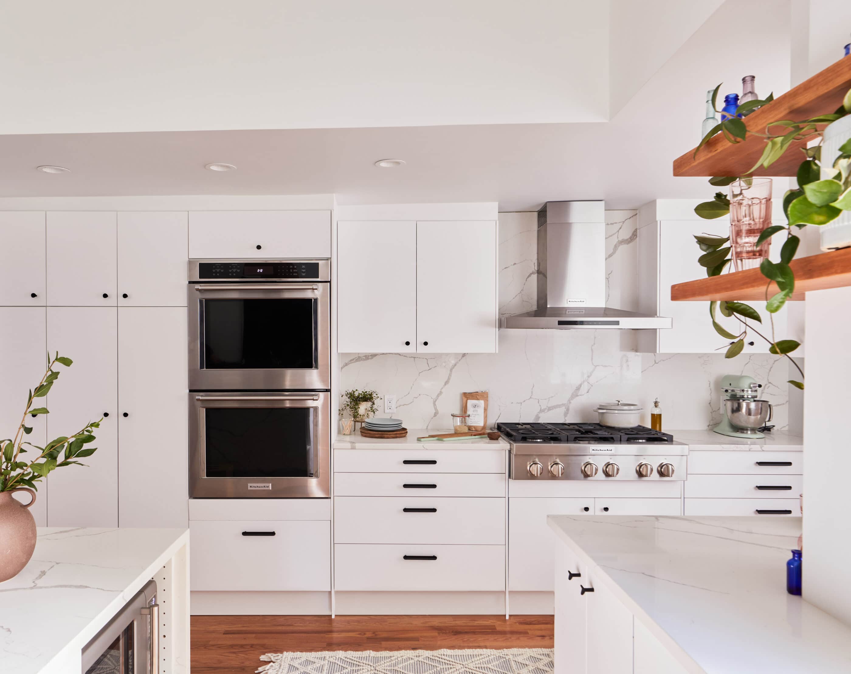 Modern flat-panel cabinets, Salt Slab from BOXI by Semihandmade in matte white, also played a large role in brightening the space, since the slab design feels modern and clean, she explains. Everything she had initially looked at reminded her of her parent’s home. Think dated wood finishes, plus long lead times that would have them out of their kitchen eight to 12 weeks at minimum. BOXI, on the other hand, were easy to order and the installation process was seamless.