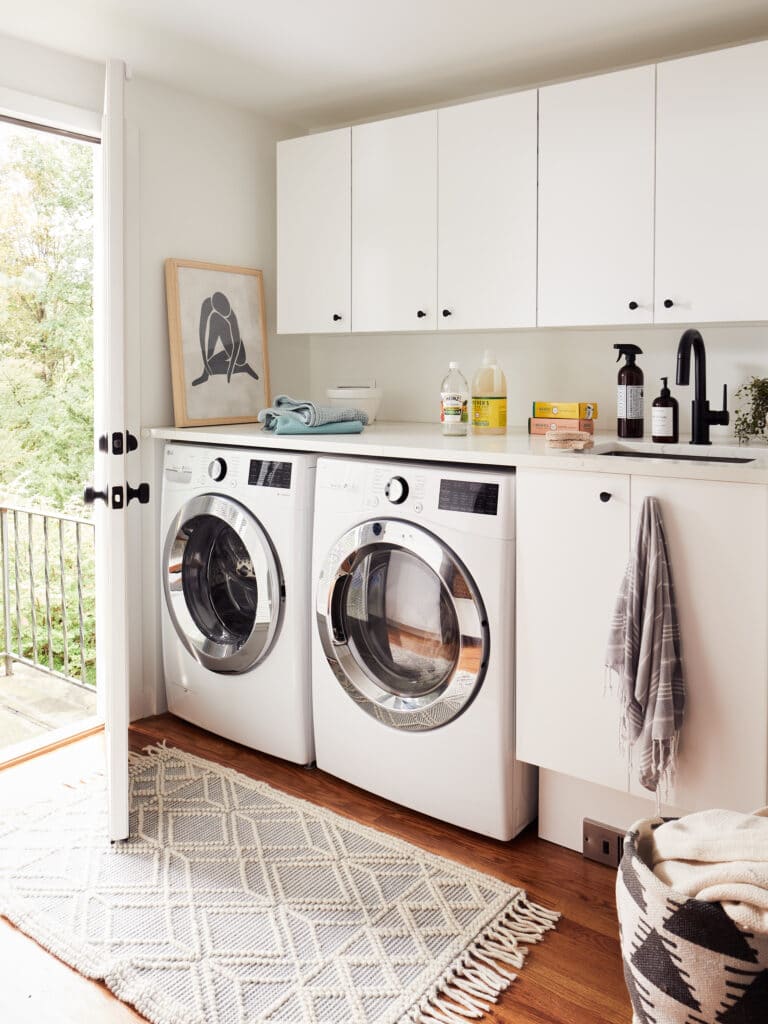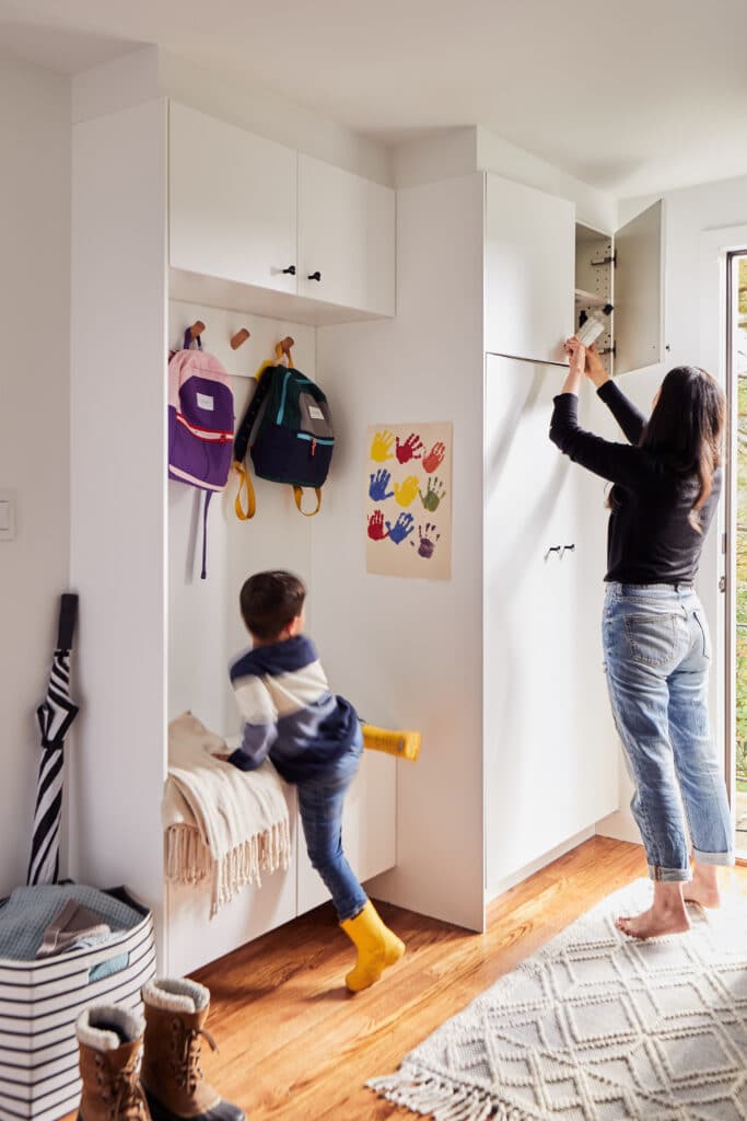 For ease, they also designed a mudroom and laundry area. “For the mudroom, we wanted to optimize the very small space and keep it open, but still visually appealing,” she says. “We added a partial wall to hide the washer and dryer and serve as a separation for the two spaces.” Since this is the entryway to the home, it serves as a place where the family can drop their things, store coats, as well as the children’s backpacks, shoes, and more.