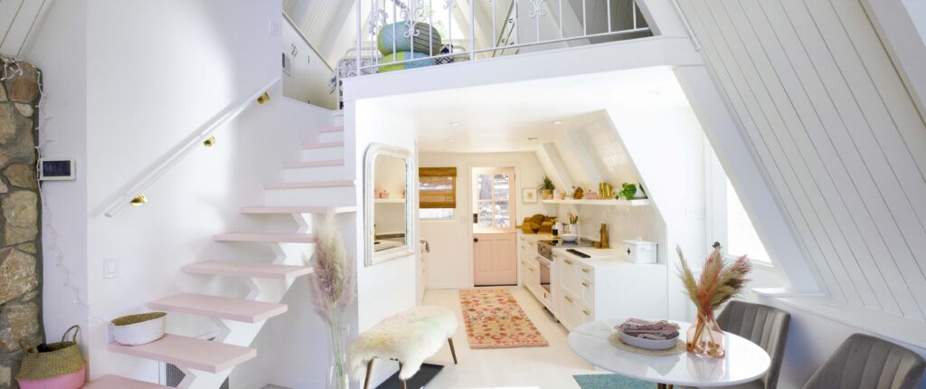 Thrailkill’s decor ignores the wood-covered and plaid-heavy tropes of the typical mountain cabin in favor of her preferred interior style: a combination of bright white and bubblegum pink finishes that make guests feel like they’re staying in mid-century modern Barbie’s dreamhouse. “The goal was to create a comfortable place, but I definitely lean towards the feminine, so it’s a different version of cozy,” Thrailkill describes. “I wanted it to be whimsical and playful.”