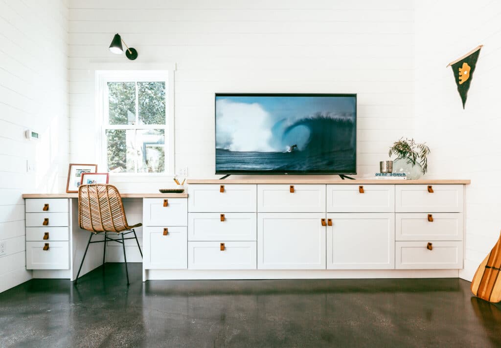 To maximize space, Ellis combined a home office, a media console, and ample storage using a slew of IKEA Sektion cabinets. She retrofitted some of the boxes to achieve a proper desk height, eliminating two five-inch drawers using power tools, and kept the console cupboards the original height for optimal film viewing on the big screen television.