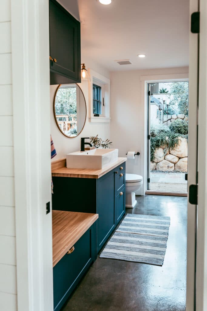 Guests might be surprised that the shower is outdoors, but Ellis insists it’s refreshing. The half-bathroom is reserved for washing up and changing by a storage bench she fashioned using IKEA refrigerator cabinets and Semihandmade Supermatte Night Sky Shaker fronts. She cut off the back of Sektion boxes to customize a matching vanity. It’s DIYed to perfection.