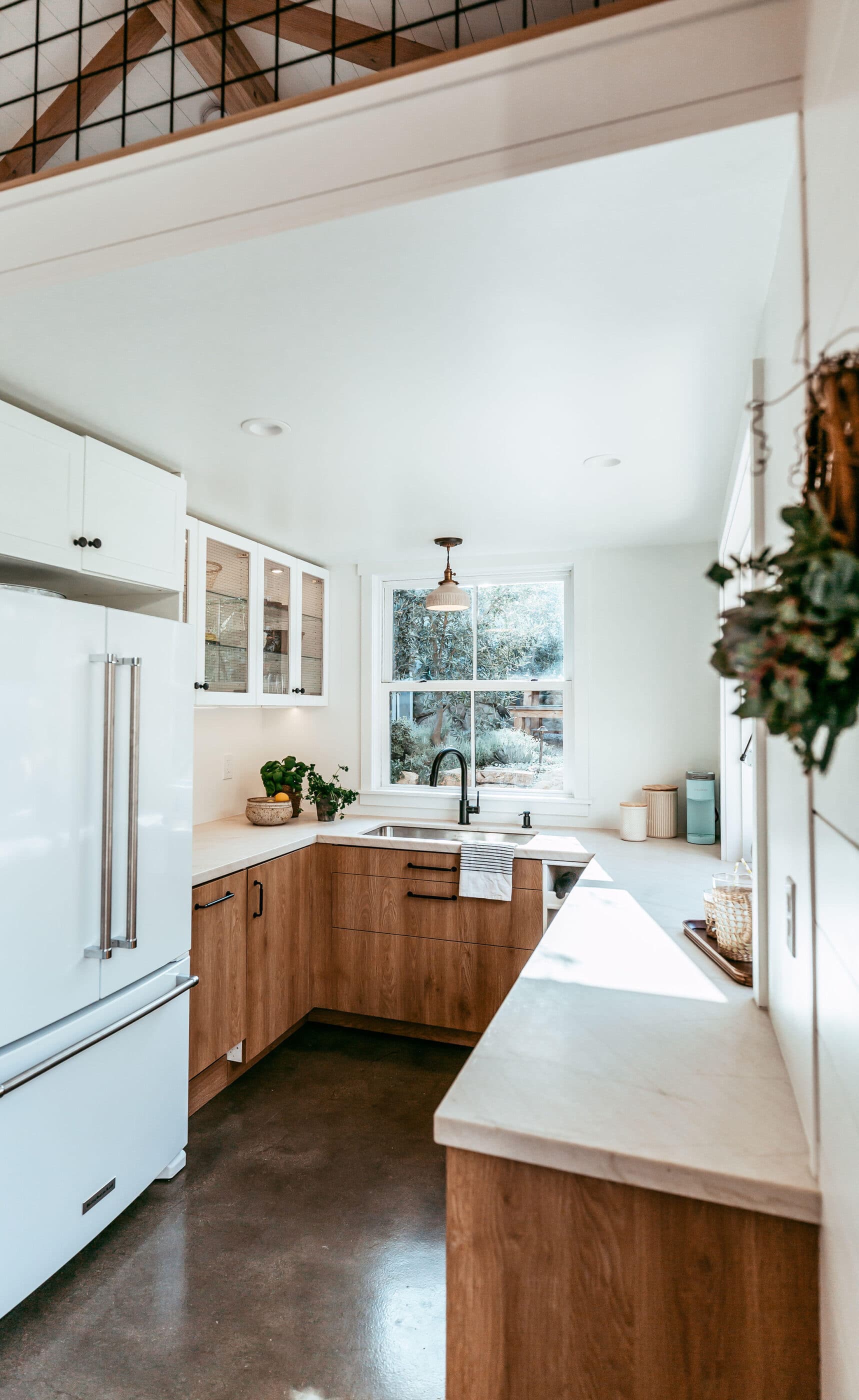 In the kitchen, Ellis inverted the material pairing from her storage wall, mixing Semihandmade Impression Tahoe wood grain cabinet doors with white quartzite counters. The flip creates continuity among the hues and textures throughout the cabana, while introducing a novel design that gives the cookspace its own vibe.