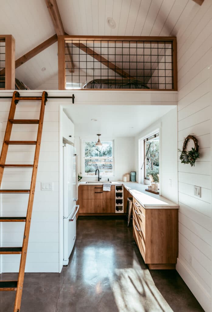 Ellis made this multipurpose dream a reality with a clever floor plan that includes a half-story twin bedroom loft, a desk-console hybrid, and a galley kitchen that feels airy thanks to an awning window. The place is complete with a black, white, and wood palette and a coastal aesthetic that mixes traditional style with modern touches.