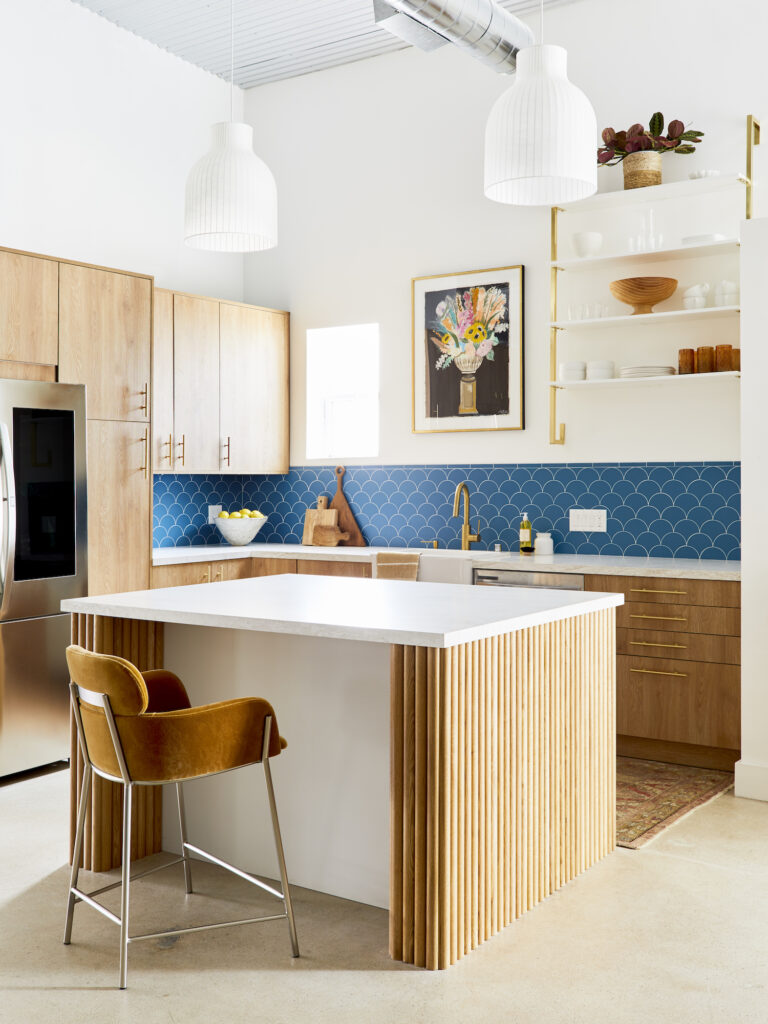 Murphy matched the wood stain on a custom, reeded island base built by her carpenter, and chose velvet bar stools in a similar amber shade for a distinct tone-on-tone effect. “It’s a little unexpected,” she explains. “Though I stayed within the same color family, there is still a lot of movement due to different textures and materials.”