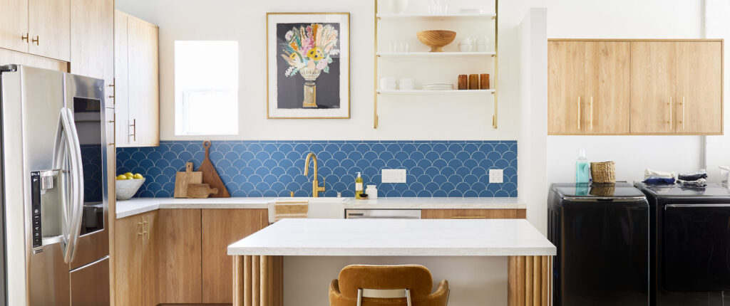 As a nod to the company’s work with pre-worn garments, Murphy decided the kitchen should have a vintage appeal. That’s why she chose Semihandmade Impression Tahoe fronts for all the cabinetry. “They don’t feel brand-spanking-new, even though that is what you’re getting,” she describes. “There is a depth to them that I really enjoy and they bring so much warmth.”