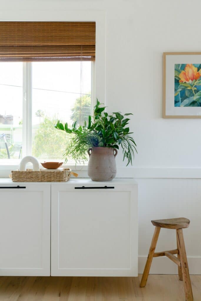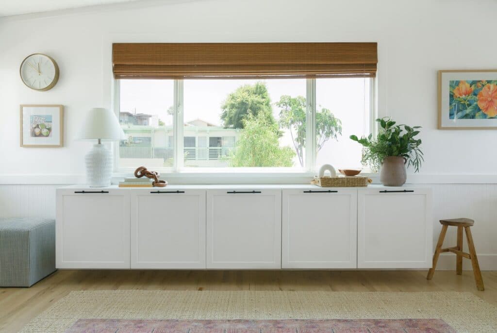 Designer Hillary Calvert took playroom storage to the next level with this floating, mounted unit featuring Supermatte White Shaker fronts and Lewis Dolin hardware. “Besta was the right option for this project due to the amount of wall space we were working with,” Calvert says. The deep Besta cabinet bases fit perfectly within the room’s dimensions and created easy-to-grab playroom storage. She notes, “Sektion cabinets would have been too tall to fit under the client’s windows.” Keep the interior cabinets of large Besta frames like Calvert’s open or add shelving to customize internal organization.